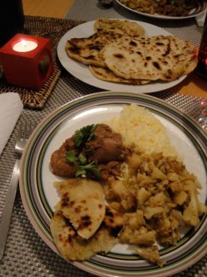 A part Gobhi Sabji (Choux fleurs sautés) et Chicken Tikka Masala (Poulet à la sauce au yaourt et aux tomates)  que j’avais déjà essayés auparavant, j’ai confectionné pour la première fois le pain à l’indienne aux patates ‘Parata’ (Cliquez ici pour les détails, si ça vous intéresse!) ; bjm, de son côté, a préparé sa spécialité Riz de Himalaya au safran (‘lovingly washed!!’) …