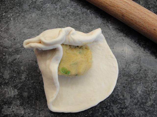 要するに小麦粉でつくったパン生地に 味付けをしたマッシュポテトにコリアンダー(香菜)の刻んだ葉っぱも混ぜたのを包んで、もういっぺん平らに伸ばして焼いたものです。考えたらカロリーたっぷりに決まってるけど、かりっとしたパンで美味しくて思わず食べ過ぎで、今日は胃袋が休憩状態・・・