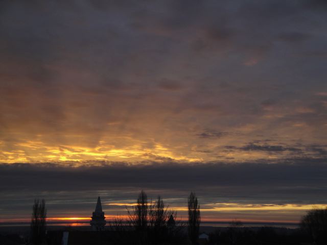 | Ce matin, un peu avant 8h… un paysage spectaculaire! こんなドラマチックな日の出が見られました。朝8時ちょっと前。 |