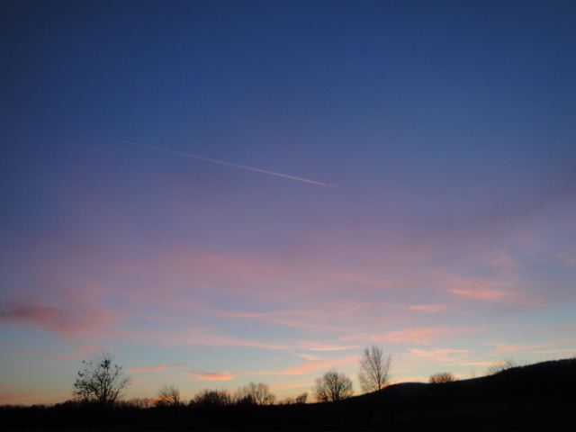 | Il était un peu tard pour partir en promenade. Les nuages roses annoncent une autre journée de beau temps? 明日も天気になるかな〜 飛行機雲までピンク色に染まって、とてもきれいでした。 |