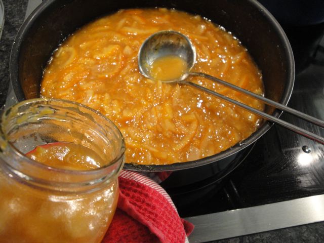 L’été dernier, je me suis mise à essayer d’autres sortes de confitures à la rhubarbe-orange, aux cerises-cassis etc. mais finalement ce que préfère bjm est vraiment la marmelade d’orange tout court. Et c’est maintenant vraiment la saison des grosses oranges espagnoles. Par un temps brumeux, humide et froid comme aujourd’hui, c’est une excellente manière de parfumer la maison dès le matin.