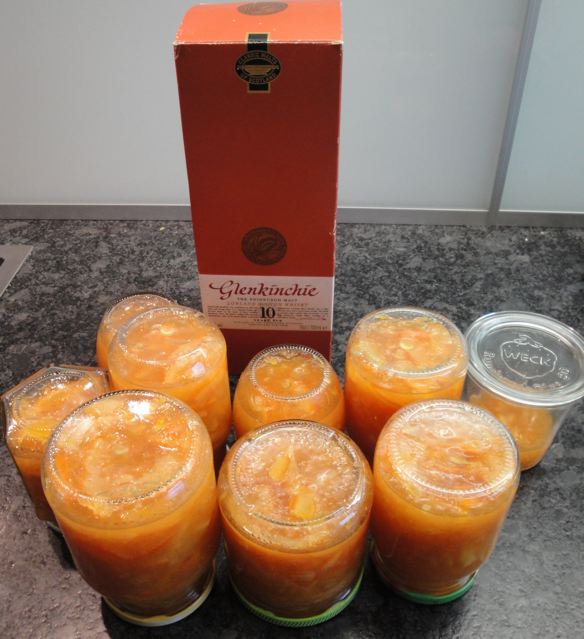 En plus, notre ami allemand Georg nous a offert plusieurs bouteilles de whisky écossais de très bonne qualité, spécialement dédiées à la ‘fameuse marmelade de Sachan’!! C’est que ce sont des bouteilles qui ont été éjectées de sa grande collection de whisky, uniquement parce qu’elles n’étaient pas ‘numérotées et enregistrées’ dans son livret de collection…. bizzzzzzarrrrre!!! mais enfin vu que sa collection compte quelques centaines de bouteilles, si ces quelques unes débordent et viennent se rendre utiles dans ma marmelade qui va faire plaisir à tout le monde… pourquoi pas???