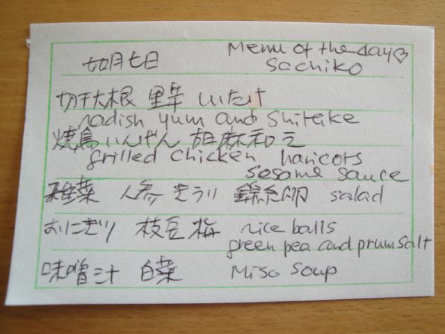 料理大好きsachanですが、やっぱり日本食を食べ慣れてない人にも喜んでもらえるメニューはどうしようかなあ〜??といっしょうけんめい考えて、今日は野菜中心の女のひと向きの軽いランチ。メニューを日本語で書いておいたら(←bjmのアイデア)、「こんな文字を書くなんて信じられない!えっこれはインゲンなの?このサラダには人参が入ってるわね・・・」とか、すっかり盛り上がっていましたよ。