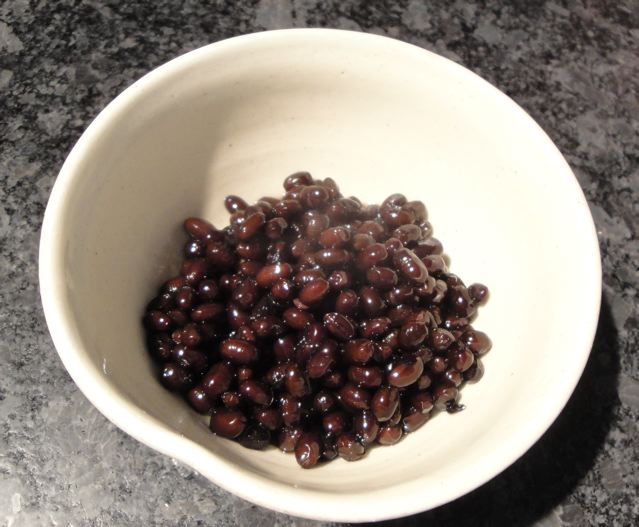 J’ai précieusement cuit les petits poids noirs de Hokkaido. C’est ce qu’on appelle Kuro-Mame en général et on en mange pour le Nouvel An, mais cette fois-ci c’est encore plus spécial comme ces jolis paquets de Kuro-Sengoku-Daizu (黒千石大豆)étaient arrivés ici directement de Hokkaidô après un très long voyage…