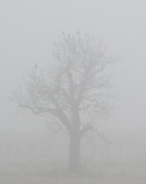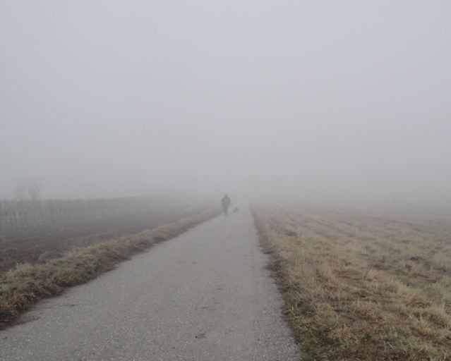 今朝少しだけですが、外の空気を吸いに歩きに行ってみました。畑の道は、霧におおわれて景色がちっとも見えません。細かい霧雨、足下も凍っているし、早々に切り上げて帰ってきました。