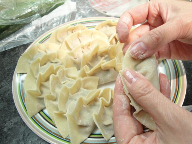 Voici donc la suite de mon expérimentation culinaire avec les feuilles de Bärlauch ! Vendredi soir nos amis  Fritz et Roswitha sont venus déguster un repas avec des ‘Raviolis chinois à l’ail des ours’, variante asiatique’. Un grand succès, je dirais, vu qu’ils ont très vite tout mangé!