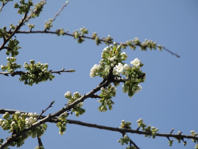 | Ce coup-ci, un cerisier? 今度はサクランボの花かな?まだ二分咲きといったところ でも、つぼみが ぎっしりいっぱい |