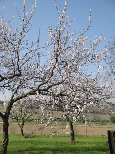 | Les fleurs de cet amandier étaient déjà presque finies et les autres arbres commencent à fleurir… このあいだ花盛りだったアーモンドの樹は もうほとんど終わりに近づいていました。 そのかわり他の樹が花をつけています。あちらのほうの斜面にレンギョウがいっぱい。 |