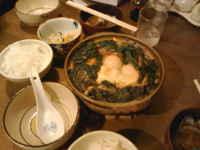 | ほうれん草 でっかい豆腐 キムチ それに餃子と卵も入った 暖かいチゲ鍋!!それに アサリの味噌汁と大盛りご飯。 外はなんだか寒い夜でしたが、すっかり暖まっておなかがいっぱい。 |