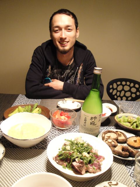 | Poisson, plein de légumes et une bonne bouteille de saké… Une soirée vraiment sympa avec Ma-chan mon fils. 展覧会の帰りにいっぱい美味しいものを仕入れてきて・・・のんびり おうちご飯。 また次のときまで 元気でがんばってね♡ |