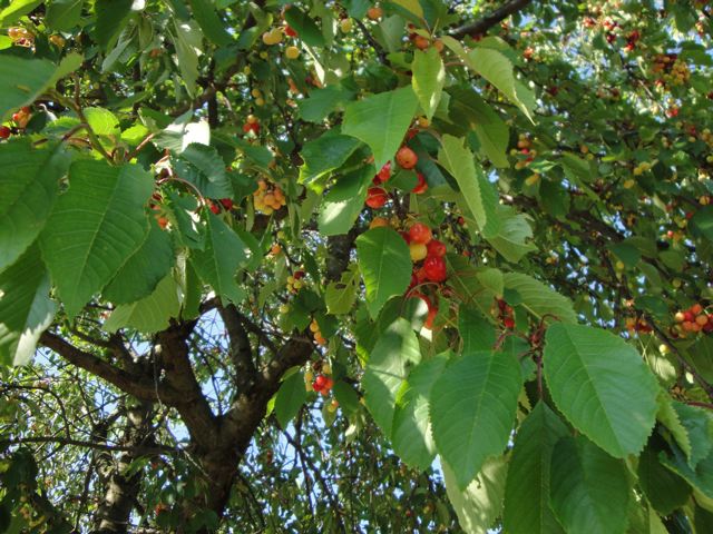 木の実や葉っぱがすっかり大きく元気に繁って緑が鮮やか☆ さくらんぼの樹もほうぼうでかわいい実をつけていて、赤いのはもう取って食べられます。甘くて美味しい♡