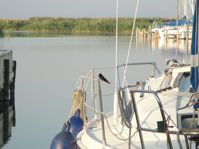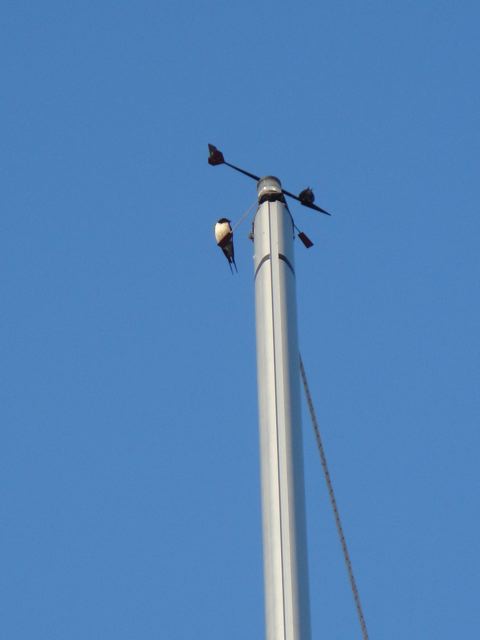 ツバメさんがヨットのてっぺんに とまってるところ。