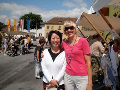 日曜日は村の「サクランボ祭」でした。インギやカトリンと待ち合わせして行ってきました。他の友だちにもいっぱい会って、おしゃべりしたり店を見てまわったりして・・・楽しかったです。生のサクランボ山のように売っていますが、他にもサクランボ酒、サクランボパン、サクランボ酢、サクランボジュース・・・それからサクランボの模様の手提げ袋にキッチンタオルとか☆