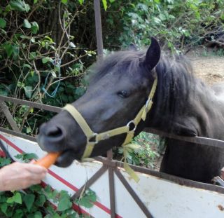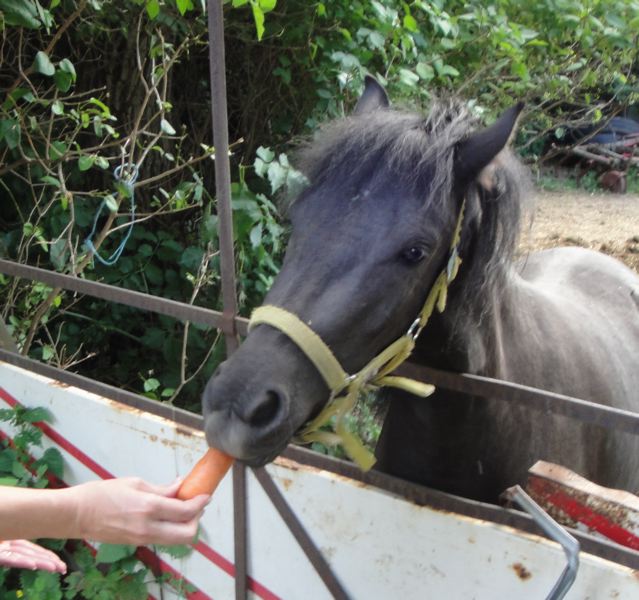 De temps à autres je retrouve mon petit copain poney noir et ce coup-ci je lui ai donné – pour la première fois- quelques morceaux de carotte.