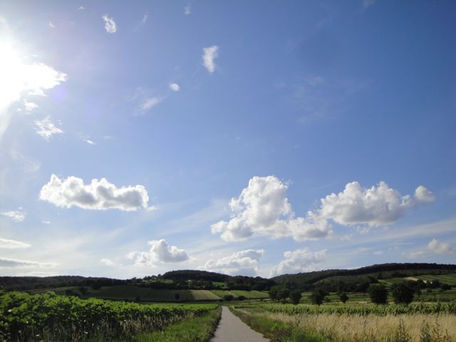 ほんとに気持ち良い道ですよ〜 いつも同じ景色なんだけど、畑も空もいろんな色に変わるから退屈しません。でもね、何気にかなりの上り坂なんですよ まっすぐだから「ひーこら」歩いてます 特に暑いときはね・・・