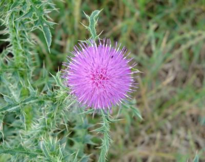 雷嵐の翌日の今日は爽やかな快晴。畑の道を遠くまで歩いてきました。ヒマワリの花も少しずつ増えてるし、アザミもきれいに咲いてて、いかにも夏!という感じの景色になっています。ブドウの実も、ちっちゃな赤ちゃんのような房ができています。去年の今ごろよりも天候が良いので、今年は豊作になると良いですね。