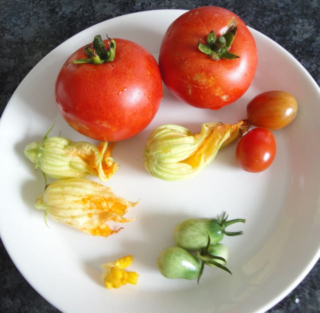 | Ces petites choses si délicates… j’ai mangé ces trois fleurs. Délicieuses mais vraiment minuscules! 今朝の収穫♡夏の色! こんなにきれいな色と繊細なかたち。自然の力に感謝です。 緑色のは 風で落ちてしまったミニトマトです。かわいそうなので拾ってきました。 |