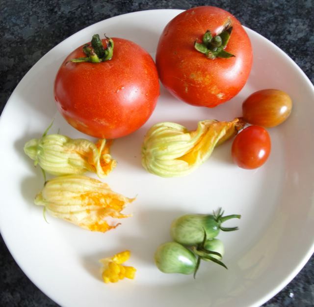 Par contre, j’ai ramassé juste quelques fleurs pour les manger farcies avec du riz-viande hâchée-poivron et oignons, rapidement cuites à la sauce tomates maison.