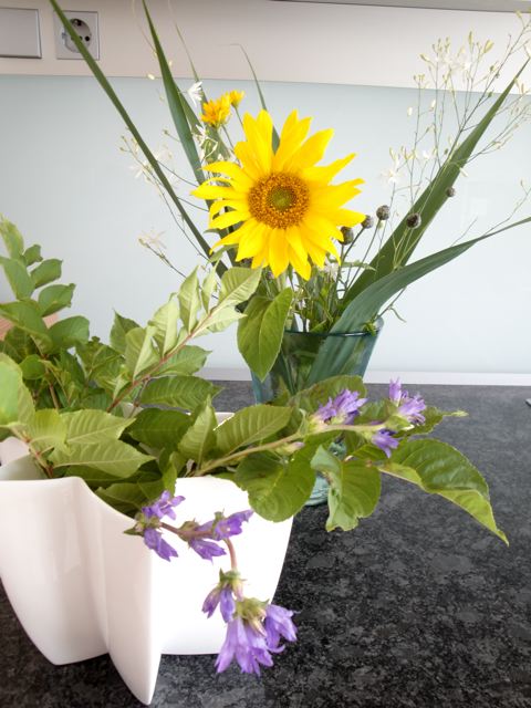 Ma copine i. est là cette semaine ici et on se promène, on cuisine et on travaille ensemble. Vendredi nous sommes allées ramasser des fleurs au ‘Mont Totoro’ et j’ai essayé de faire de petits bouquets à la japonaise. Bernie est revenu de New York samedi matin… ‘Welcome home! ‘ et ‘back to normal’.
