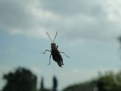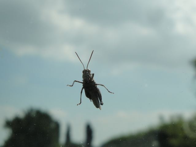 | Cette sauterelle m’a suivie jusque chez nous, collée contre la vitre de la voiture!! この小さなバッタさんは 「トトロの山」から家まで 車のガラスにしがみついて来たのです。 お疲れさま〜♪ |