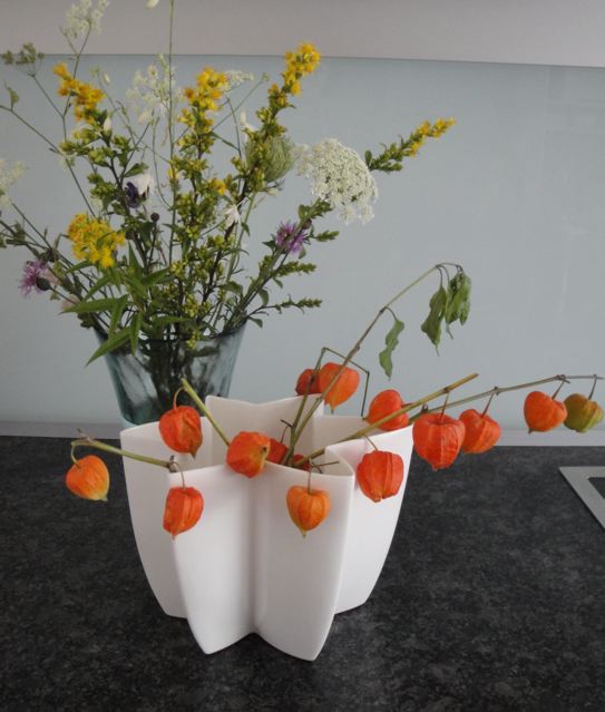 J’ai pris le temps de refaire mes petits bouquets avec des plantes fraîches – y compris ces petites ‘alkékenge‘. Fritz notre ami m’a appris qu’on l’appelle Lampion en Autriche (Lampionblume).