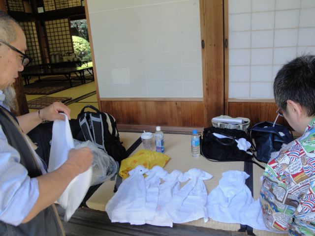 村井さん、午後の「まけないぞうトーク」では、被災者の方々にぞうさんの作り方を教えるやりかた=一枚のタオルから糸と針の手縫いでぞうさんの形を作るやりかたを説明することになっています。リュックのなかから「順番に完成するまでのぞうさん」たちを取り出して縁側に並べていました。