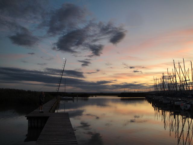 反対側は夕焼け空。カモたちのガーガー騒ぐ声は聞こえたけど、もう暗くて姿はあまり見えませんでした。