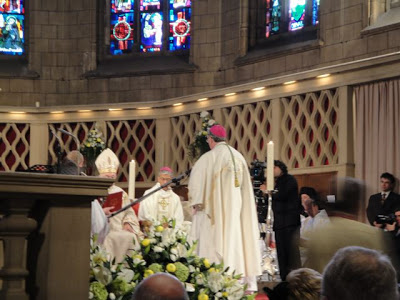 段の上に登っているのは各地から来た偉い司教さん、大司教さんたち。はじめはケルンと東京と、もうひとりの「先輩」大司教さんたちが儀式を進めて、途中で「大司教さんのかぶり物(ミトラ)」「指輪」「杖」の3種類のお道具を渡して、中央の椅子に座らせて、めでたく「就任完了」。そこからあとのミサは、新しい大司教さんが進められました。