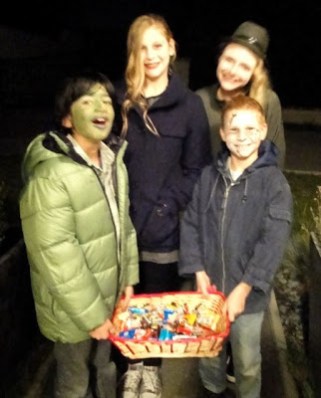 Le 31 octobre au soir, nous avons eu juste ce petit groupe d’enfants qui sont venus sonner à la porte pour nous dire ‘Happy Halloween’… qu’est-ce qu’ils sont mignons!! J’avais eu un fiasco il y a juste 2 ans quand on venait de nous installer ici, ignorant totalement que ça se pratiquait ici. Je ne sais pas ce que je fabriquais l’an dernier….(peut-être bien que j’étais au Japon?) Cette année j’avais acheté un sac de bonbons pour pouvoir leur donner… mais il y avait juste ce petit groupe, alors il en reste plein… Toujours est-il que c’était adorable de les voir déguisés et tout souriants.
