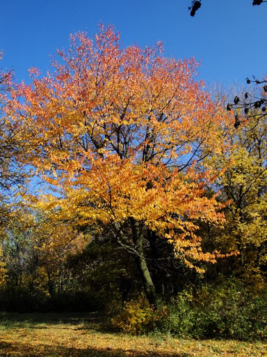 Le long de ce grand espace, je vois quelques arbres avec de magnifiques couleurs. Ils sont forcément plus exposés que les arbres dans le bois.