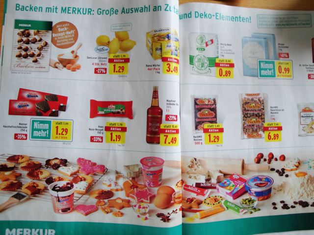 En regardant le dépliant, je vois souvent ‘ statt 2.49 … 1.99 ab 2 Fraschen’… et ainsi j’apprends que ‘statt’ veut dire ‘au lieu de’,  ab= à partir de / Fraschen=bouteille(s) Le ‘plateau’ de fruits assortis est ‘tasse’ et ce mot est autrichien. C’est intéressant d’observer tout ça mais le pb est qu’au supermarché je ne dirai jamais ‘Haben Sie bananen?’!!!