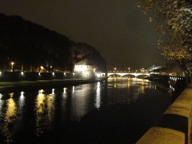 川のほとりがずうっと散歩道になっていて、向こうのほうには昔 街を守るため砦みたいのを築いた名残が残っています。学生のときから、しょっちゅう通ってた道だから、昼間でも夜でも、すごく懐かしい景色なのですよん。