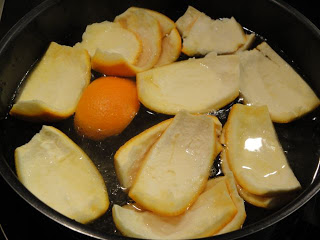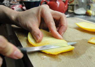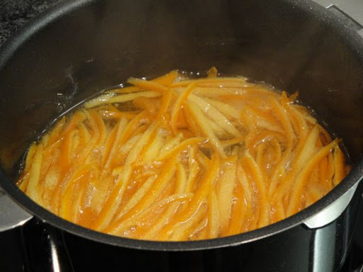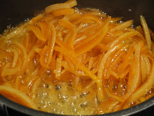 6)そこへ オレンジの皮を入れて、ゆっくり煮詰めていきました。