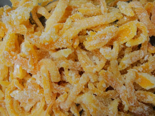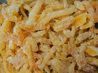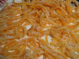 7)最後は焦げないように気をつけます。全部を煮詰めるところまでいかないで、最後 ちょっと水気(というか、もうオレンジ色の飴みたいな状態)が残っているところから、お箸で皮をとって、お皿に砂糖(まぶすぶん)を広げてあったところに広げます。