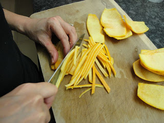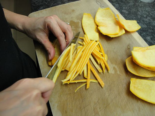4)それから、今回は 薄っぺらくなった 表の皮を、こんどは細く千切りにしました。