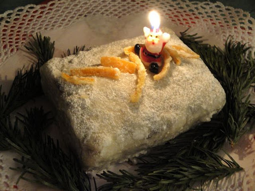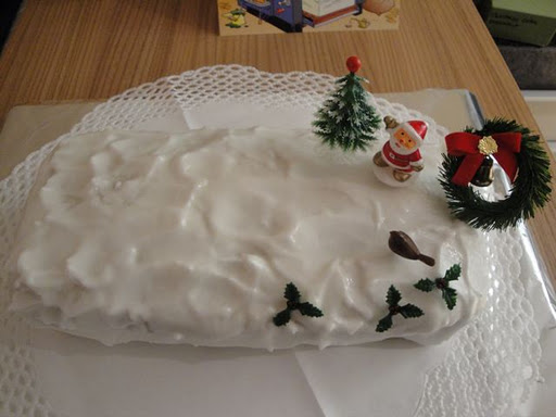 今年は マーマレードにラム酒を加えて暖めたものを、刷毛で塗って、そのうえから薄く延ばしておいたマジパンを貼りつけました。