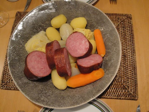 Saucisse de Morteau, que j’ai ramené de Besançon bien sûr… avec des légumes.