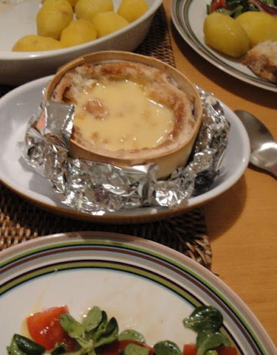 モンドールのホームページを見て、箱ごとオーブンで暖めて(その名も ボワット・ショード 「熱い箱」!)にしてみました。料理とも言えないほどカンタン〜♪ 真ん中にちょっとスプーンで穴あけて、白ワイン少し入れて、底がぬけると困るから下にフタをつけて、アルミホイルもつけて、オーブンで全体がとろとろになるまで焼いたら・・・ 二人サイズの「ミニ・フォンデュ」の出来上がり〜