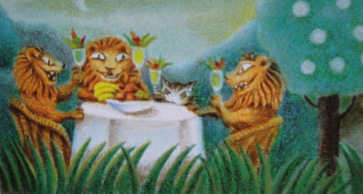 Et donc j’ai fait un gâteau aux bananes, suivant la recette favorite de mon filston Ma-chan, qu’on a trouvée dans le bouquin du chat Dayan. C’est un chat qui voyage, qui se fait des amis dans un coin vaguement tropical, dans un pays magique, passe par des expériences un peu bizarroïdes, il trinque avec ses amis lions et ensuite… vous trouvez toutes les recettes! How nice!