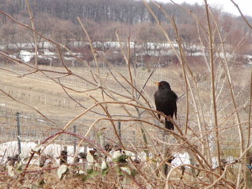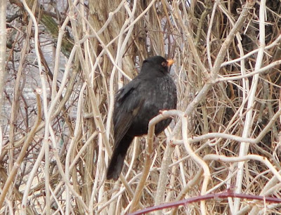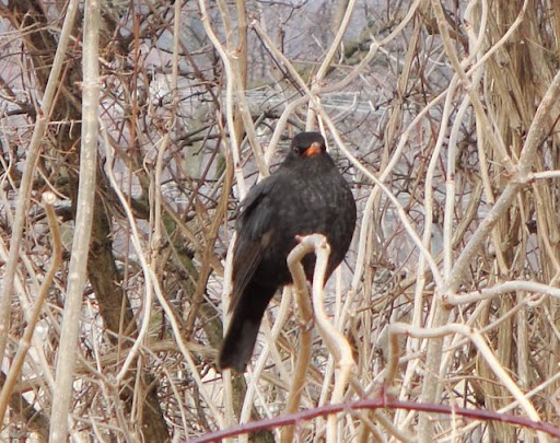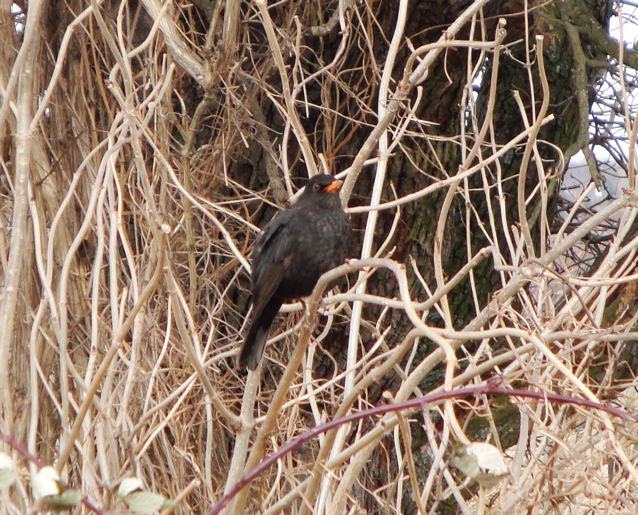 Le chemin est encore un peu humide et gelé par endroit avec un peu de neige qui reste, attention à pas glisser….  Je prends mon parcours habituel et j’ai retrouvé mon cher ami noisetier avec ses ‘chatons’ secs, ensuite je redescends pour rentrer (parce qu’il faut bientôt partir à l’aéroport)…  Et là, au coin du chemin, près du carrefour, je suis tombée sur un merle noir qui était perché dans une sorte de buisson.