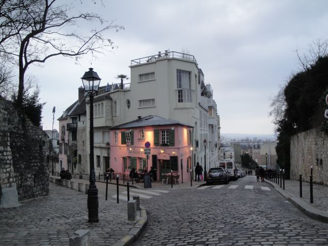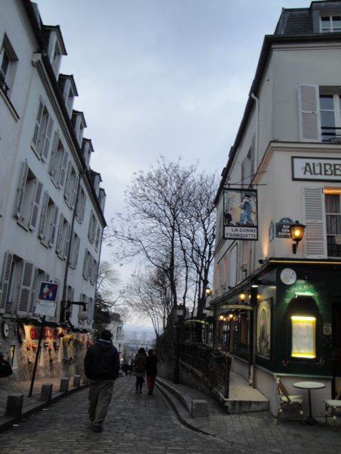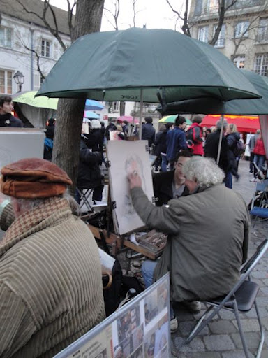 D’habitude, j’ai tendance à n’y accéder que par derrière du côté Lamarck-Caulaincourt, c’est un très beau quartier avec ces escaliers qui grimpent et de très jolis bâtiments et maisons, des parcs, le marché St Pierre que j’aime beaucoup visiter… mais ce coup-ci nous avons fait tout le trajet touristique comme il faut, partis de la station métro Abbesses, pris le funiculaire (heureusement qu’il y avait le funiculaire! on n’en pouvait plus après ces musées!!), mis des chandelles dans la basilique, regardé les artistes faire des portraits dans différents styles Place du Tertre… ensuite trinqué à notre retrouvaille au champagne chez la tata, avant de conclure avec un dîner marocain chez Gazelle rue Damrémont. NA!!! Oh là là quelle journée! Mal aux pieds, oui, mais vraiment heureux. Merci, tata Isa, d’avoir pris le temps de nous accomagner!