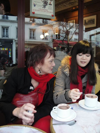 | 地下鉄をおりて近くのカフェでホットチョコレート Entre Isa-la super tata et A-chan qui n’a pas peur de parler français… c’est une grande discussion! 🙂 |