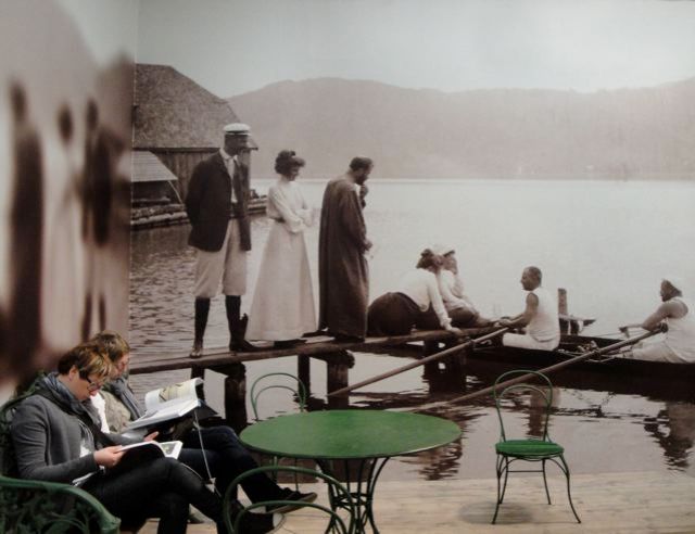 それからレオポルド美術館のほうは、また違った趣向。画家として活躍を始めたクリムトが亡くなるまでのあいだの数十年にわたって友だちに書き送っていた絵はがきや手紙が順番にずう〜っと並べられています。パリに行ってたり、ロンドンへ旅行したり、ラヴェンナへモザイクを見に行っていたり、ブリュッセルの大邸宅の装飾の仕事を請け負ってベルギーの現場に行ってたり、ウイーンにいて仕事をしていてチロルのほうの涼しい湖畔に避暑に行っている友だちに「自分もそっちに行きたいけどなー」と言っていたり、自分も湖畔に滞在して絵を描いていたり・・・それからアトリエの様子や自宅の庭の様子の写真など・・・もちろん作品もいっしょに展示されて、仕事と旅と興味を持っていたいろいろなものなどを合わせて見ることでクリムトの人物が少しわかるようになったみたい。