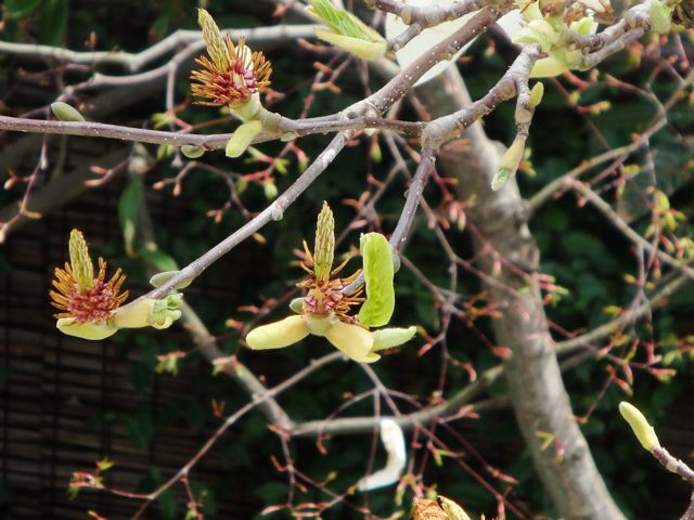 | 白蓮の花が散ったあと、葉っぱの芽が出てきていました。うしろに細かく見えてるのはカエデの芽。 いろんな種類のいろんな葉っぱが色とりどりに出てくるこの季節は、ほんとうに美しい。 |