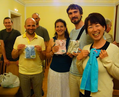 | コンサートのあとで記念撮影♪ 黄色のシャツの方がアンドレアスさん、まけないぞうを買って、 まわりのひとにも紹介してくださっているそうです。 … et j’ai rencontré des amis de Narasaki-san, qui ont adopté eux aussi les éléphants Makenaizô. Youppppiiiii!! Super rencontre! |