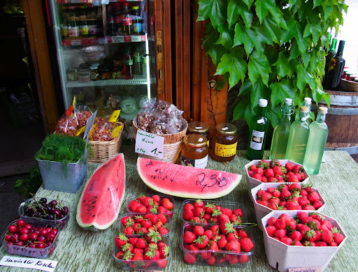 | 店先は、こんな様子。スイカもおいしそう! でもイチゴを買ってきましたよ。甘くて美味しい〜!! Tout est super frais. Ce sont de vrais trésors…. |