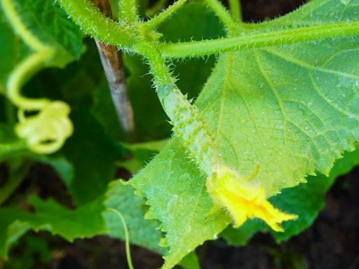 | キウリの赤ちゃん。まだ3センチぐらいしかないけど、ちゃんとキウリのかたちをしてる!! Les petits bébés concombres sont là!! 3 cm de long… |
