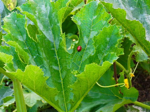 | ズッキーニの葉っぱがすごく大きく広がっています。またテントウムシがいた! どうも種類がいろいろ いるみたい。 |