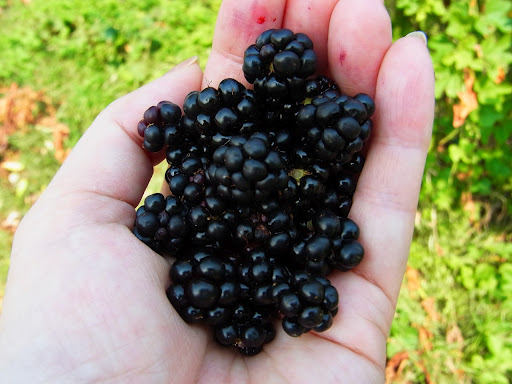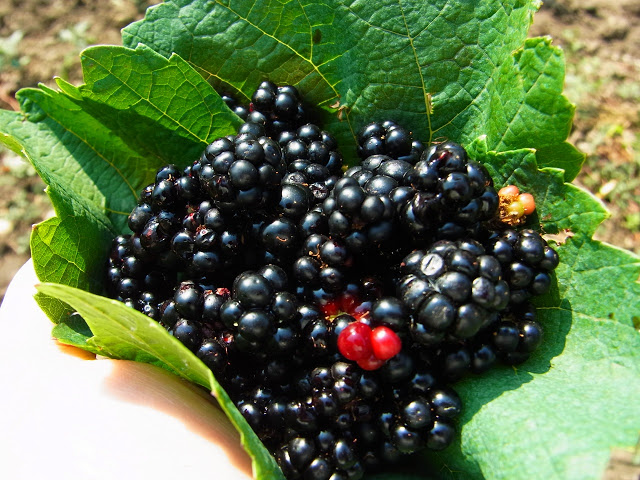 | Je n’avais pas de sac… alors j’ai pris juste une feuille de vigne pour ramener des mûres cuillis, que j’ai congelés en attendant d’en aoir assez pour pouvoir essayer de faire une confiture!! |