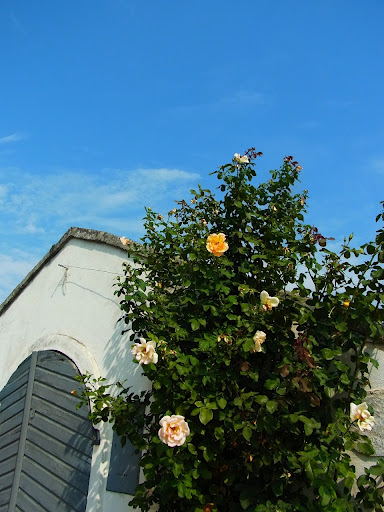 | 今日はきれいに晴れて、青空が出ました! Très beau temps, ciel bleu et les roses étaient très belles, rue de la cave. |